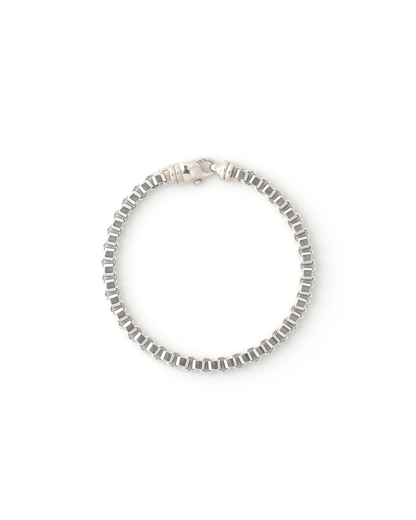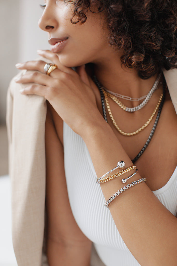 Another modern go-to chain. Hand-finished in rhodium on a sterling silver base, this chain holds its own but can also be layered with other pieces for a bold and modern look.