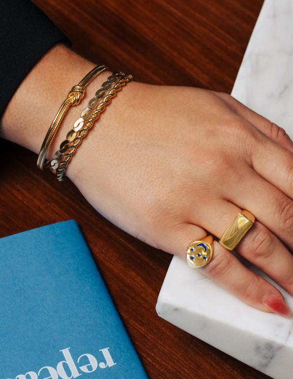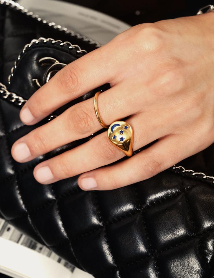 Introducing the Sogni Azzuro Ring, inspired by dreams and intuition, and designed to captivate with its celestial elegance. This stunning ring measures 13mm x 3mm, showcasing intricately etched stars and moons enhanced with cobalt blue enamel, evoking the mystical allure of a starry night sky. Crafted from luxurious 18K Gold Vermeil on 925 Sterling Silver, it promises both beauty and durability. The Sogni Azzuro Ring is perfect for those wishing to add a touch of celestial charm and sophistication to their collection.