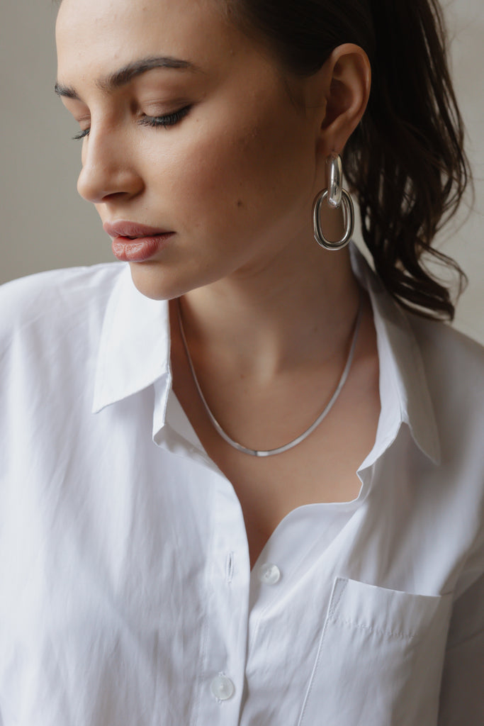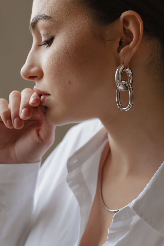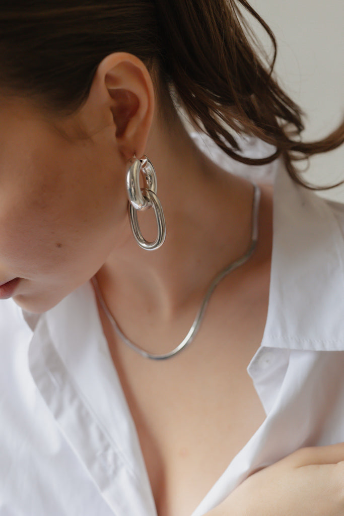 From our Runway Collection, a chunky take on our classic hoop, these two-in-one high impact tubular drop earrings can be worn with or without their rectangular drop hoop. Finished with a drop down clasp for extra security, these earrings are made in rhodium on a 925 sterling silver base.