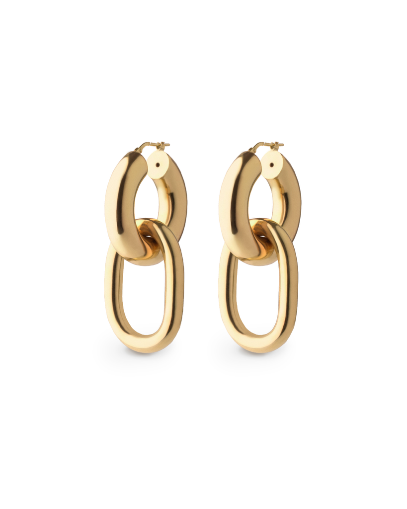 From our Runway Collection, a chunky take on our classic hoop, these two-in-one high impact tubular drop earrings can be worn with or without their rectangular drop hoop. Finished with a drop down clasp for extra security, these earrings are made in 18k gold vermeil on a 925 sterling silver base.