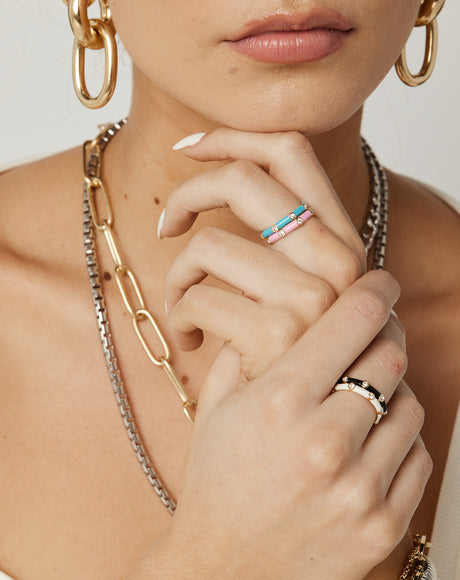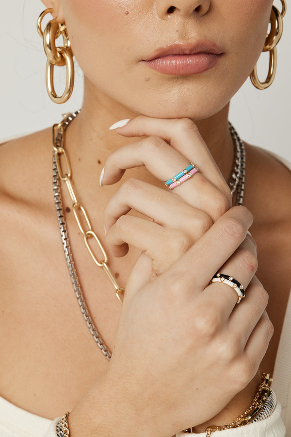 The ultimate addition to your ring stack, our enamel and cubic zirconia studded ring bands are made with glass free enamel with 18k gold vermeil on a sterling silver base. Featuring 8 white cubic zirconia stones, the Costella Rings are best paired with our Amalfi and Ferrara bands for a dramatic stack.