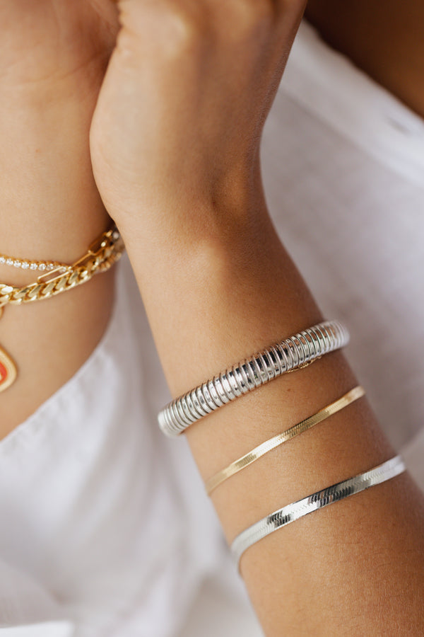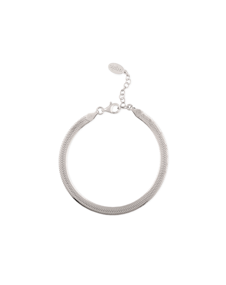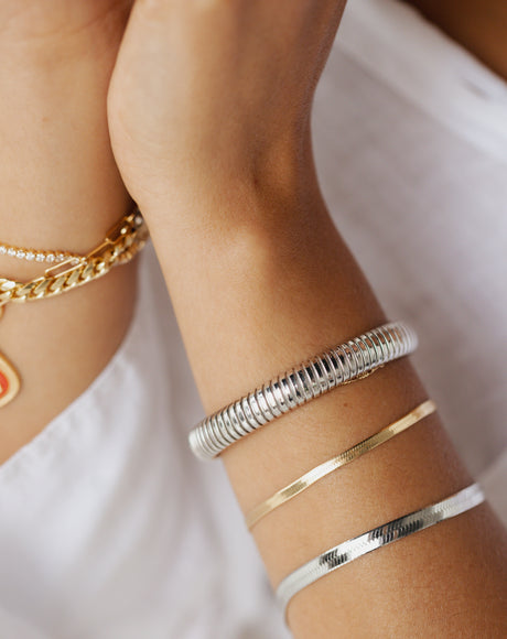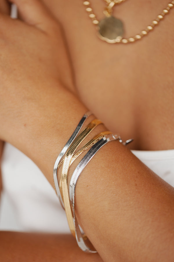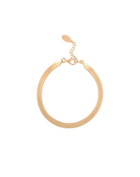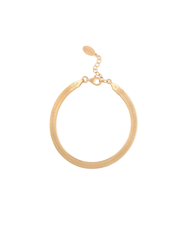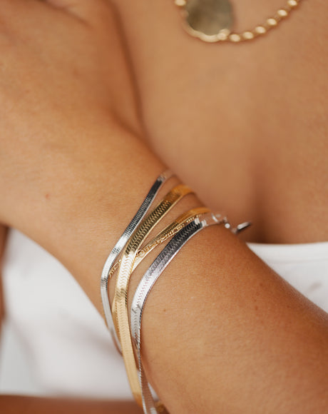 Introducing the Grande Oro Bracelet - a thick band, sleek and silky Gold Herringbone piece that effortlessly blends polished elegance with a touch of edginess. With a width of 4.5mm and a length of 18cm, complete with a secure lobster clasp and an extension for adjustable wear. Pair it with the Mini Oro Bracelet to create a stunning layered look, and fearlessly embrace the art of mixing metals for a style that's uniquely yours.