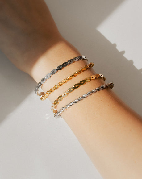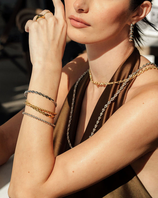 Introducing the Lilliana Cuff, a vintage-inspired weaved bangle that combines elegance with versatility. Crafted in two exquisite finishes—sterling silver with rhodium plating and sterling silver with 18k gold vermeil—this cuff is perfect for stacking or wearing alone. The intricate weave design adds an elevated touch to any bracelet collection, enhancing both individual and layered looks. Wear the Lilliana Cuffs with our other cuffs for a truly sophisticated statement that captures timeless charm and modern style.