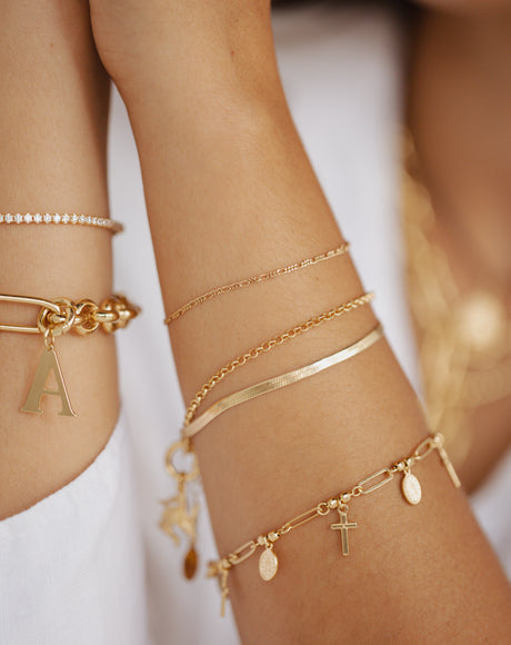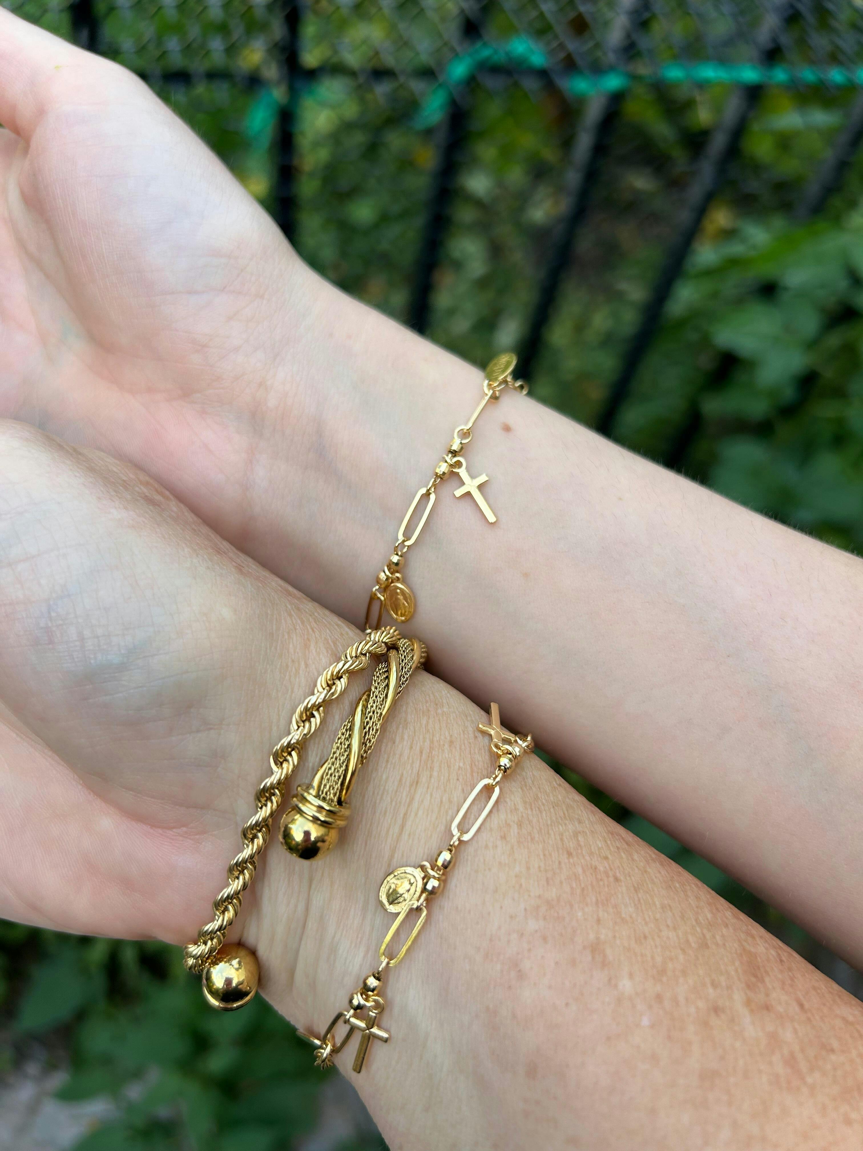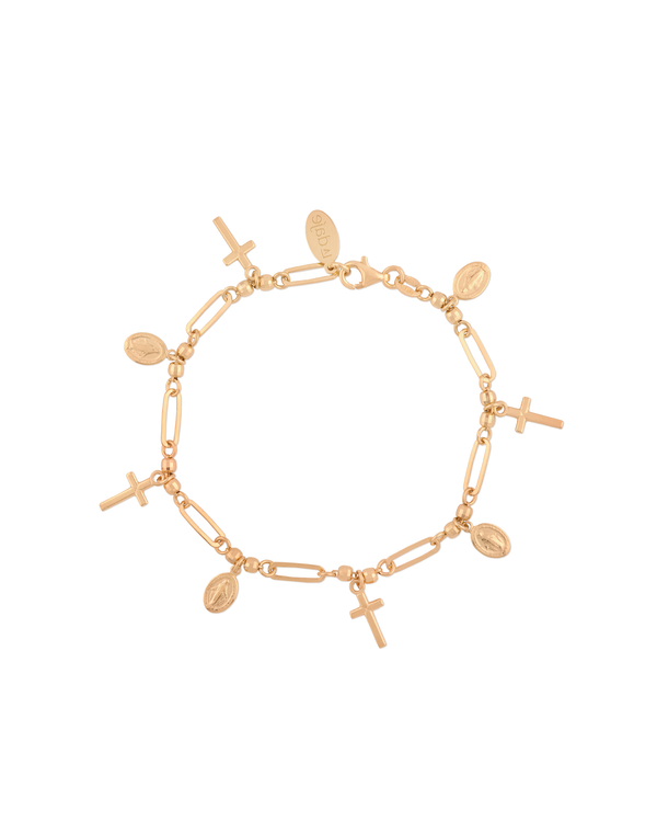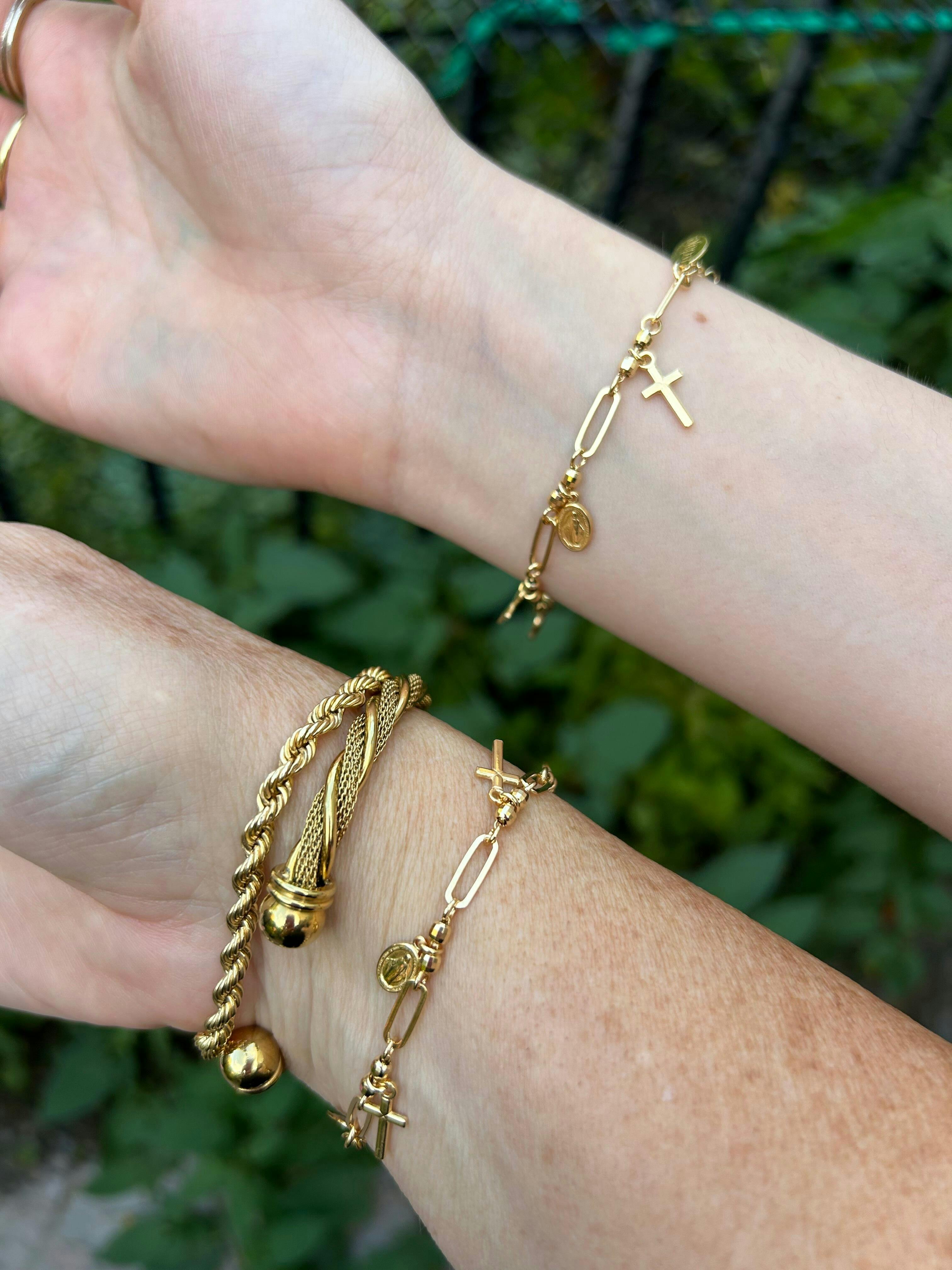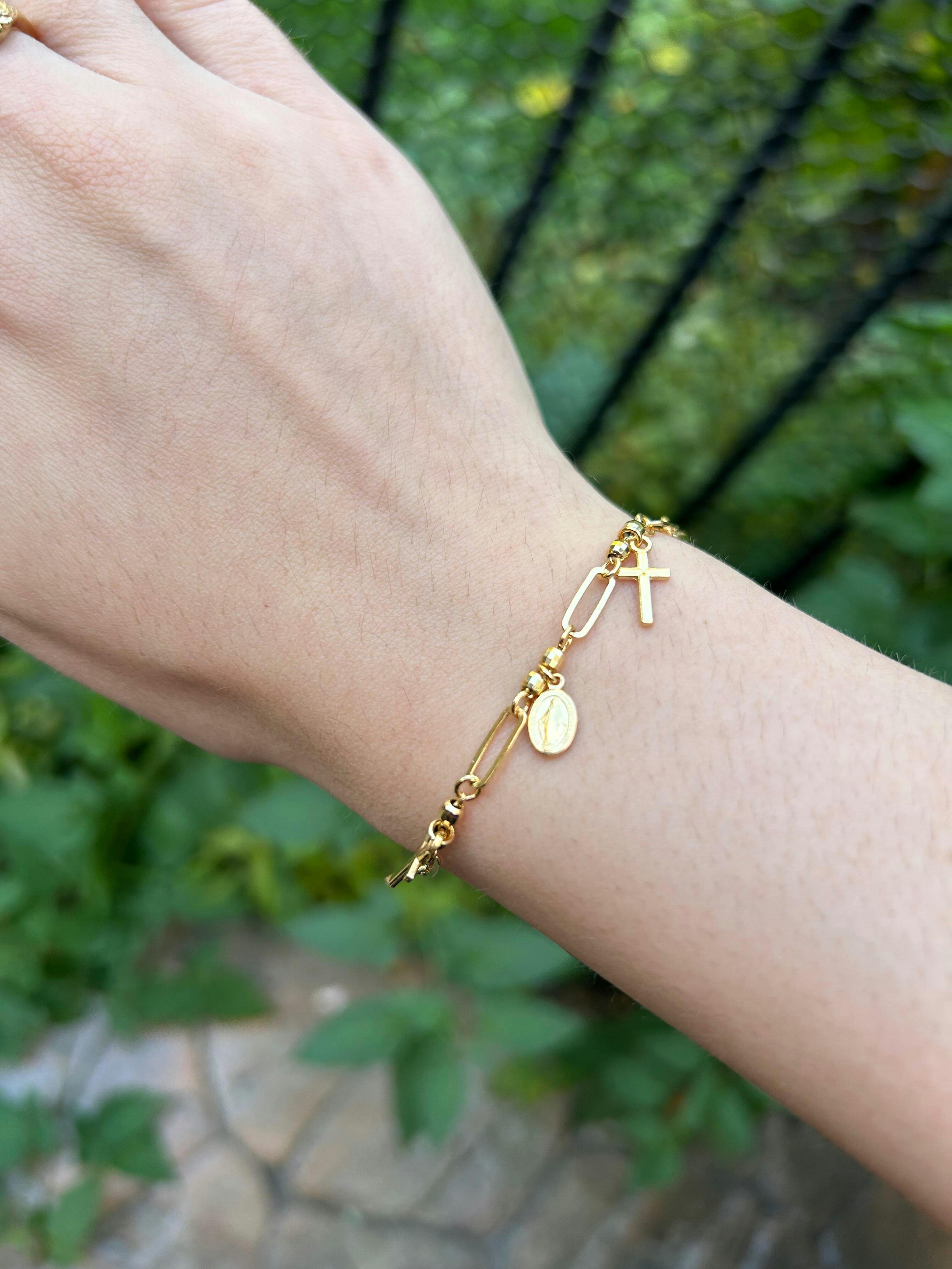 The Rosario Gold Bracelet, combining elegance and spirituality. This delicate paperclip and bead bracelet features a beautiful cross and Madonna pendant. Perfect accessory for any occasion.