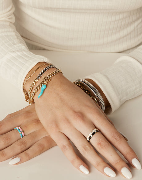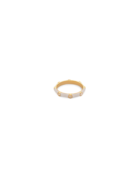 The ultimate addition to your ring stack, our enamel and cubic zirconia studded ring bands are made with glass free enamel with 18k gold vermeil on a sterling silver base. Featuring 8 white cubic zirconia stones, the Costella Rings are best paired with our Amalfi and Ferrara bands for a dramatic stack.