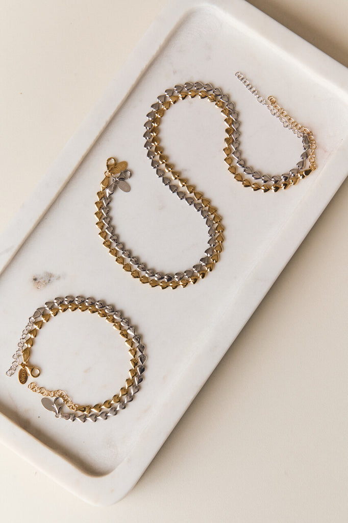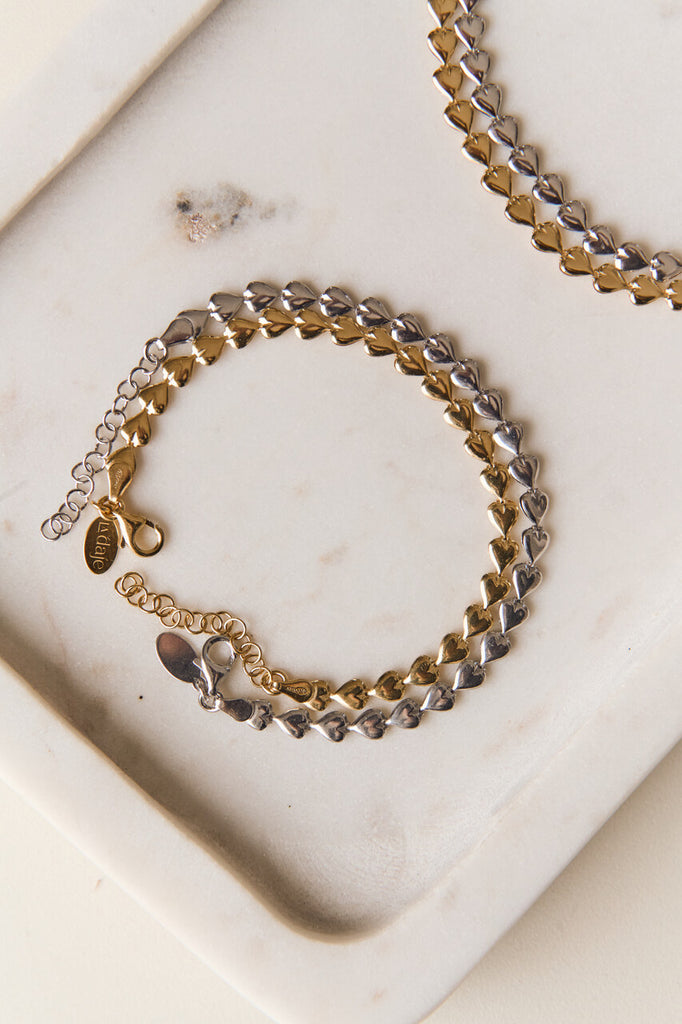 Introducing the Dolce Heart Bracelet, a captivating piece that embodies elegance and romantic charm. This exquisite bracelet features a seamless series of heart motifs, each measuring 5mm, creating a continuous heart-to-heart design that's both stunning and unique. Available in both sterling silver with rhodium plating and a luxurious 18k gold vermeil finish, it offers versatile styling options that can be worn alone for a subtle statement or layered for added impact. With a length of 17cm and an additional 4cm extension, the Dolce Heart Bracelet seamlessly blends style and adaptability, making it a must-have for any jewelry collection.
