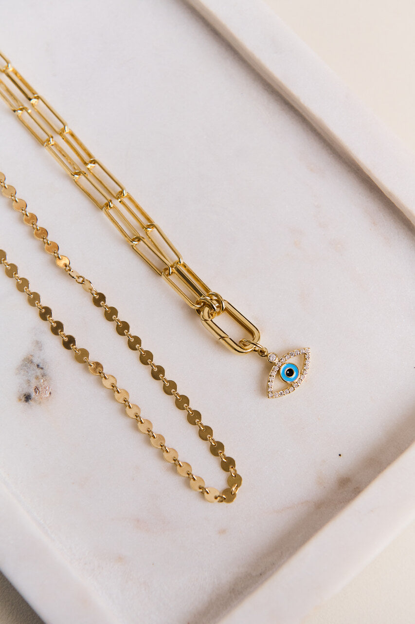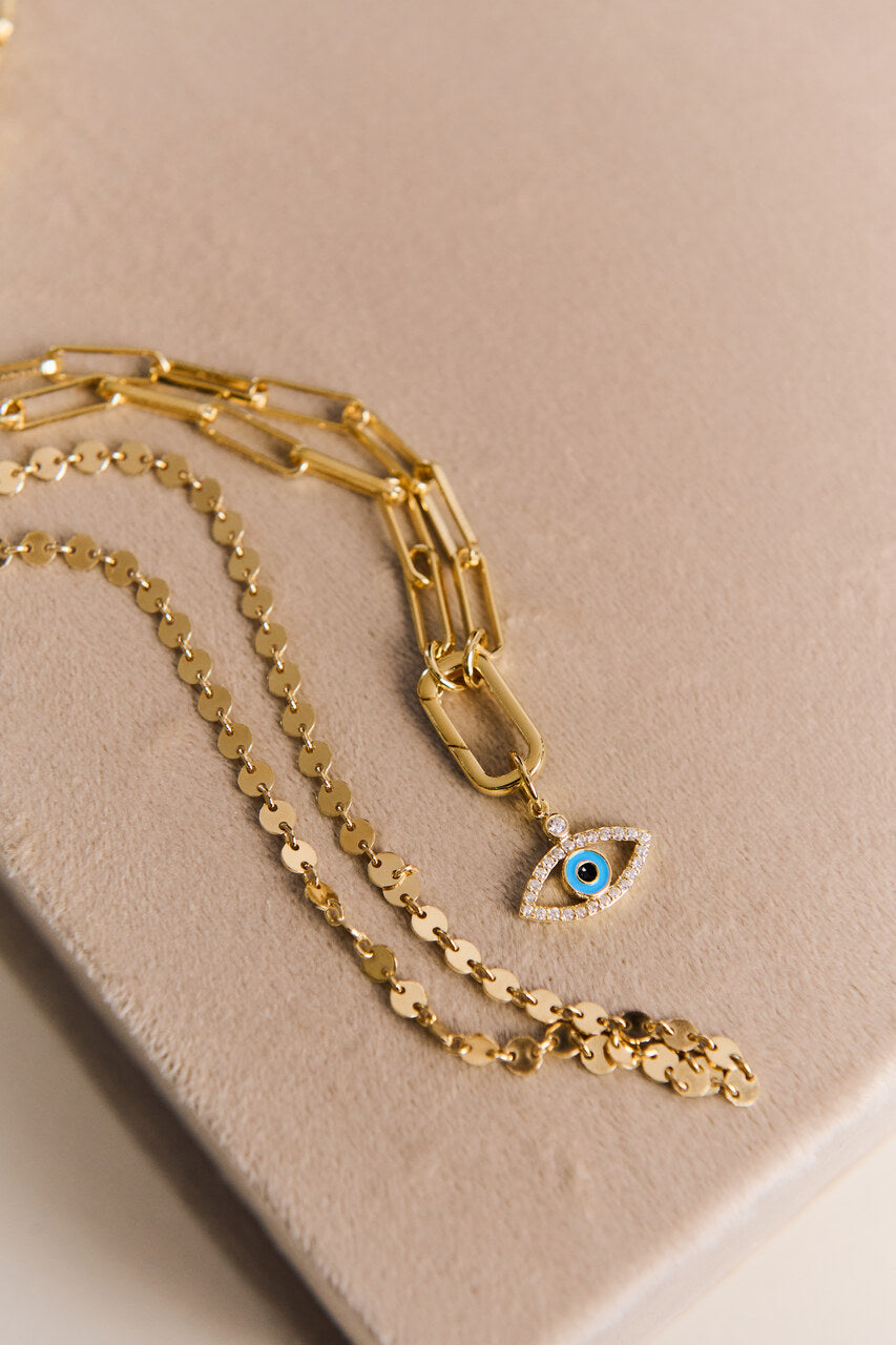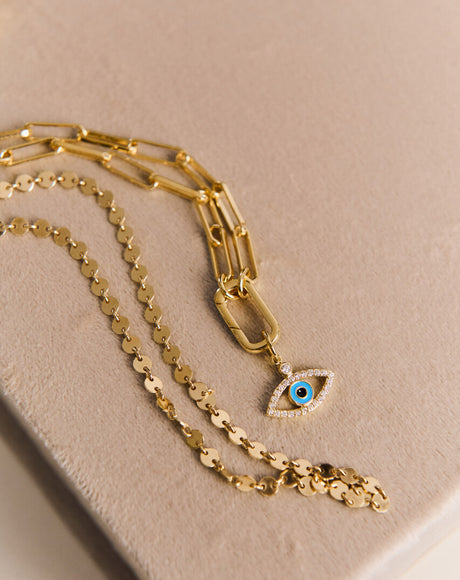 Introducing the Evil Eye Charm with Cubic Zirconia, a captivating symbol of protection and style. This elegant pendant, measuring 18mm x 9mm, features a beautifully crafted evil eye design adorned with shimmering Cubic Zirconia. Made from sterling silver and finished with 18k gold vermeil, it adds a touch of luxury to any jewelry piece. Perfect for attaching to a bracelet or necklace, this charm effortlessly enhances your accessory collection with its unique blend of elegance and meaning.