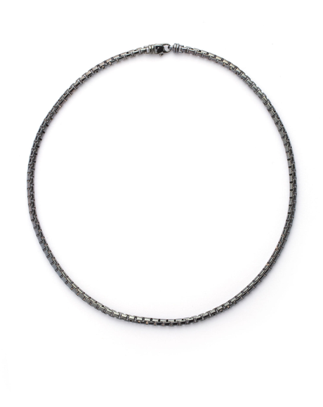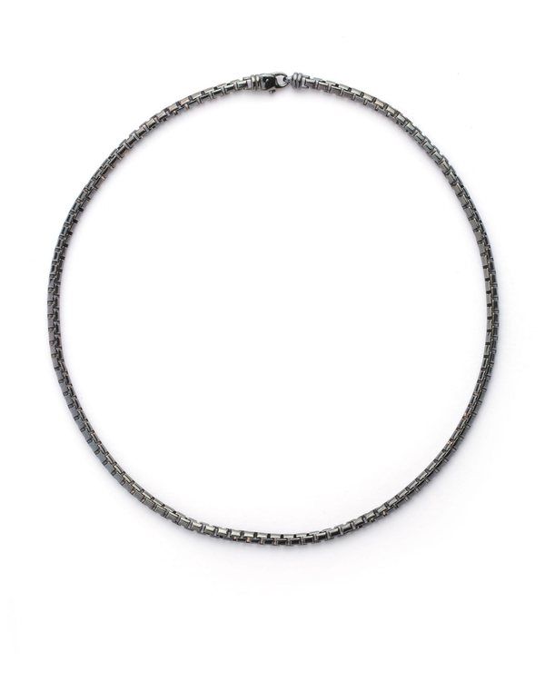 Another modern go-to chain. Hand-finished in black rhodium on a sterling silver base, this rounded chain link necklace holds its own but can also be layered with other pieces for a bold and modern look.