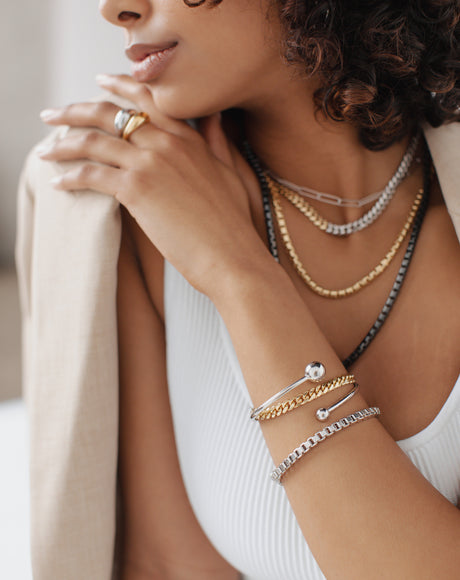 Another modern go-to chain. Hand-finished in rhodium on a sterling silver base, this chain holds its own but can also be layered with other pieces for a bold and modern look.